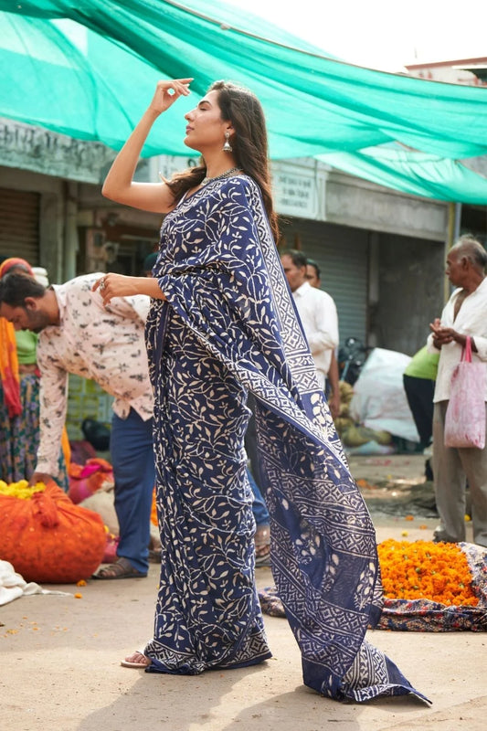 Mulmul Cotton Saree | Serene Symphony | Indian Blocks Print